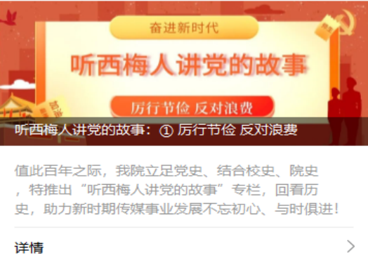 红色声音,源自人民,新闻工作者见证了中国共产党从无到有、从小到大、从弱到强的发展历程,血脉中流淌着红色基因,谱写了世界无产阶级传媒事业史的华美篇章。传媒学院立足党史、结合校史,利用新媒体平台,在微信公众号和校企合作单位喜马拉雅平台中推出“听西梅人讲党的故事”专栏,每周播出二期,每名党员讲一个党的故事。用声音传递党的故事,回看历史,点燃党员学习热情。引导党员学史明理、学史增信、学史崇德、学史力行。