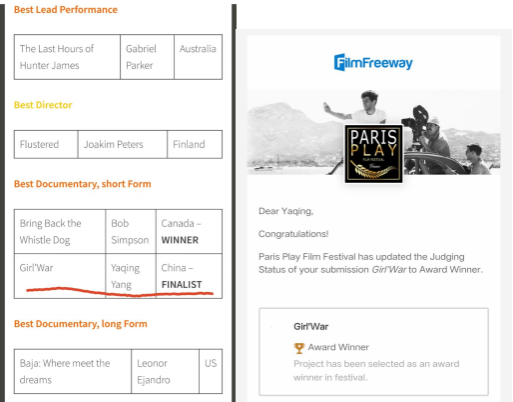 截止2023年4月该片获得第四十二届巴黎戏剧电影节荣誉提名; SAGA WIFF 女性国际电影节官方入围;意大利米兰杜米拉30电影节( Duemila30)官方入围;上海国际短片周(SHISW)官方入围及荣誉提名;第十九届广州大学生电影节纪录片单元初选入围;升空电影节-第一次网络电影人会议展映入围等,并受意大利米兰杜米拉30电影节邀请参加6月份在米兰举行的电影节开幕。