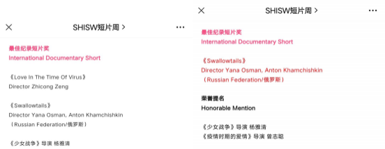 上海国际短片周 (SHISW) 一月官方入围及荣誉提名