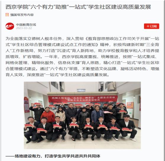 一是加强经验成果宣传报道。为努力打造“沉浸式”育人新阵地,助力学校教育教学和人才培养提质增效、扩容增能。本学期以来,我院高度重视、统筹推进,按照“一站式集成、网格化管理、精细化服务、信息化支撑”育人思路,精心打造“一站式”学生社区综合管理模式建设。通过“六个有力”举措,不断塑造文化品牌、凝练活动特色、增强育人实效,深度推进“一站式”学生社区建设高质量发展。学院总结凝练“‘六个有力’助推‘一站式’学生社区建设高质量发展”经验材料,发布学习强国、中国教育在线、陕西省教育厅官网、新华网、华商网、腾讯新闻网、群众新闻网等众多媒体,备受关注,形成了浓厚氛围。