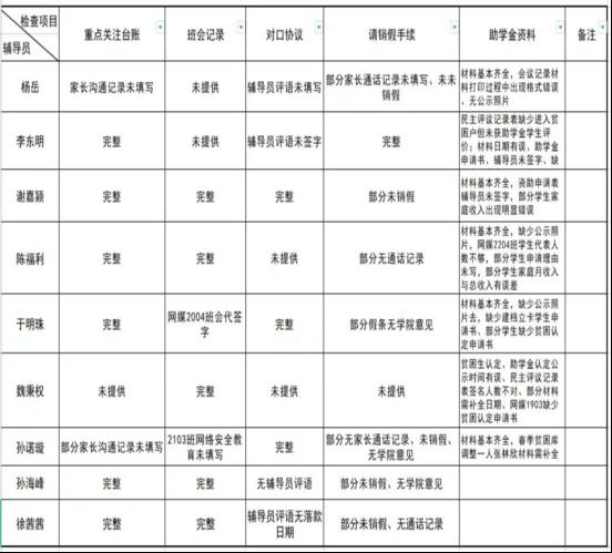 三是定期普查辅导员基础工作。学生科严格按照每周目标任务,每两周进行一次辅导员基础工作大检查,如:班会记录、考勤册、晨午晚检、谈心谈话、学风建设活动开展、严防工作漏洞和偏差,对存在的问题给予指导和帮扶,确保辅导员工作落到实处。