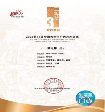 荣获2023第十五届全国大学生广告艺术大赛陕西赛区三等奖
