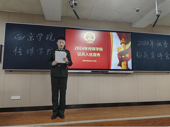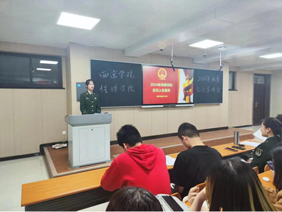 为进一步提升学生国防教育观念,营造浓厚的参军报国氛围,激发大学生报名参军入伍热情,推进大学生征兵工作深入开展。4月24日,校征兵工作站征兵宣讲团赴传媒学院开展征兵宣讲会,面对面帮助广大学生解读征兵政策,鼓励更多有志青年从军报国。