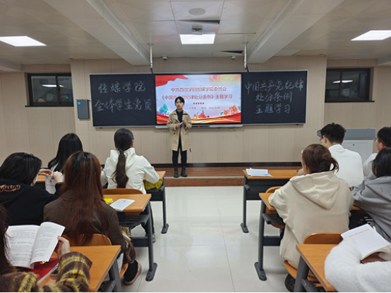 为全面落实党纪学习教育,筑牢全体党员党规党纪意识,始终做到守纪律、讲规矩、知敬畏,不断提高政治素养,提升廉洁自律,营造全面从严治党的良好育人氛围。4月29日,传媒学院在1229教室开展全体学生党员《中国共产党纪律处分条例》(以下简称《条例》)集中学习。传媒学院纪检兼保卫委员任青青老师作专题讲解,60余名党员参加学习。