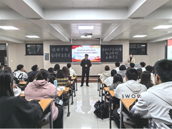 学院党委组织委员孙海峰充分结合当前大学生党员历史使命和时代责任,围绕学院教育教学质量提升和学风建设,对全体与会党员进行了思想上的动员和行动上的要求。他指出,国有国法、党有党规,国因法而治、党因规而强。当学生党员是新时代党的事业的接班人,更是推进社会主义建设和参与民族复兴重任的中坚力量。夯实政治基础,筑牢党纪法规,始终做到心存敬畏,手握戒尺,慎独慎微,勤于自省是当代青年当学生党员的政治标准。一名党员就是一面旗帜,要在党纪学习教育中不断强化纪律意识,在学院建设和发展过程中积极发挥辐射带动作用,真正把党纪学习教育贯穿学习和生活全过程。
