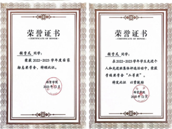 通过不懈的努力,她在大一第二学期学习成绩取到专业第四,大三一学年学习成绩达专业第六,在2020——2021、2021-2022、2022-2023学年总成绩平均分均达80分以上。多次专业成绩达年级前10%,在学好专业课的同时,她积极考取各类证书,现已通过全国普通话等级考试,拿到二级甲等证书、计算机一级等。
