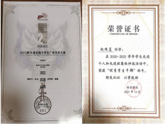 在专业竞赛中:参加第七、第八届“互联网+”大赛,参与省级金奖项目1项、主导校级金奖项目1项、校级银奖项目1项。参加省级大创项目1项、校级大创项目2项。参与大学生广告创意大赛荣获省级二等奖,拍摄作品入围陕西省公益广告优秀视频作品名单等。同时在专业技能上,考取DaVinci Resolve(达芬奇)专业调色师认证、中国民航轻型民用无人驾驶航空器操作员资质等。