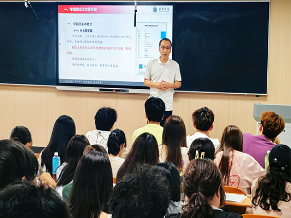 根据学校教务处及传媒学院的教学工作安排,为了帮助2024级新生更快熟悉我校学籍管理规定,更好地适应大学生活,9月4日和5日下午,传媒学院副院长李政和教务科科长朱先雷在一号教学楼大教室,分别对2024级三个专业的大一学生进行了学籍宣讲教育。