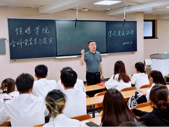 传媒学院充分利用党员的先进性和先锋带头作用,召开全体党员、入党积极分子大会,率先开展学习领会,带头落实学风建设20条。学院党委副书记、副院长,学生科科长分别就推进《学风建设20条》进行了再动员、再部署。要求全体党员佩戴党徽、亮身份、树标杆,带头明确和执行学风建设20条规定。党员们纷纷表示,要充分发挥先锋模范作用,带头遵守学校的规章制度,引领班级学生认真听课,不做低头族、不玩手机、不睡觉,确保到课率、听课率、持书率、前三排就坐率。带头落实“早到十分钟”学风建设文化,带头参加学科竞赛和各项二课堂活动,端正学风、扭转班风,积极为营造良好的学风作出自己的贡献。