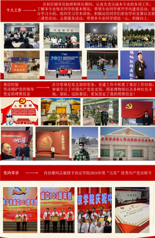 肖佳雄在党务工作中同样展现卓越风采,担任党小组组长时,他率先垂范,积极参与支部各项活动,确保“三会一课”等组织生活有序开展。他细致入微地管理党员档案,高效有序地完成党员关系转接工作,以高度的责任心和敬业精神赢得了全体党员的广泛尊敬与认可。