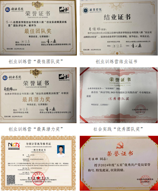 肖佳雄学业卓越,注重理论实践融合,积极参与学术竞赛与实践活动。他凭借出色表现,荣获新利18官网“创业实战精英训练营”最具潜力及最佳团队奖,传媒学院暑假社会实践一等奖,读书笔记展评三等奖,并被评为“优秀学生干部”及“五好学生”,这些荣誉充分展现了他在学术、实践及领导力方面的杰出才能与全面发展。