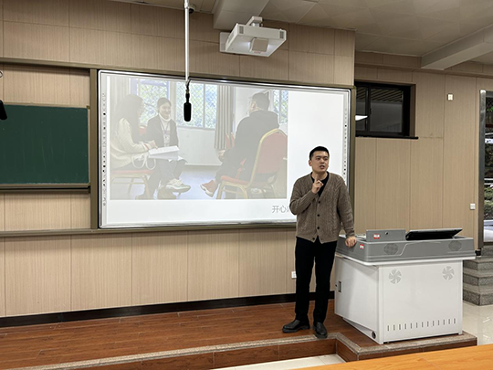这不仅是一场推介会,更是一次生动的采编实践教学。祖老师精心选取了商界传媒实习生在“开心麻花”采访现场的照片以及在“成都酷案传播”的采访合影,激发同学们主动思考,并细致地点评了采访中存在的问题。他强调,在采访实践中,记者需时刻保持着装整洁得体,态度专业严谨,不卑不亢,充分展现职业记者的专业素养。此外,他还详细分享了从联系采访对象到采访顺利完成的各个环节,鼓励同学们在未来的工作中以大方的姿态面对每一次采访任务,塑造良好的记者形象。