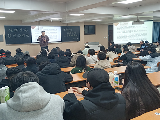 宣讲会上,九垚司辰影视基地负责人详细介绍了公司的发展历程、业务领域及未来规划。作为集短视频制作、直播运营、线下大型演出于一体的综合性传媒机构,该公司配备行业领先的拍摄设备及技术团队,构建了涵盖人防工事研学基地(AI+VR)、融媒体中心、文旅剧场等多元体验空间。同时,他对岗位需求进行了详细说明,涵盖导演助理、编剧、摄影、后期制作、新媒体运营等多个方向。他表示,传媒学院的学生专业素养高、创新能力强,正是公司急需的人才,希望通过此次招聘活动,吸引更多优秀学子加入团队。