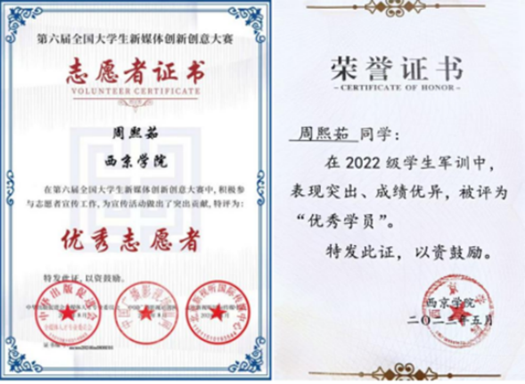 2024年8月,荣获第六届全国大学生新媒体创新创意大赛“优秀志愿者”奖项。