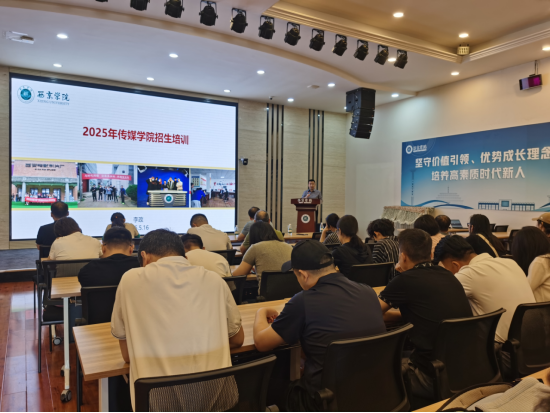会上,李政副院长重点介绍了学院三大特色专业建设情况,包括省级一流专业新闻学、新文科试点专业网络与新媒体以及校级特色专业广播电视编导,同时分享了"实验室+工作室"协同育人模式,并公布了相关招生数据,为招生宣传和考生报考提供了重要参考。李金山副院长则就新高考政策、学校人才培养特色、优势及招生策略、招生技巧作了专业解读。为做好新形势下的招生工作指明了方向。