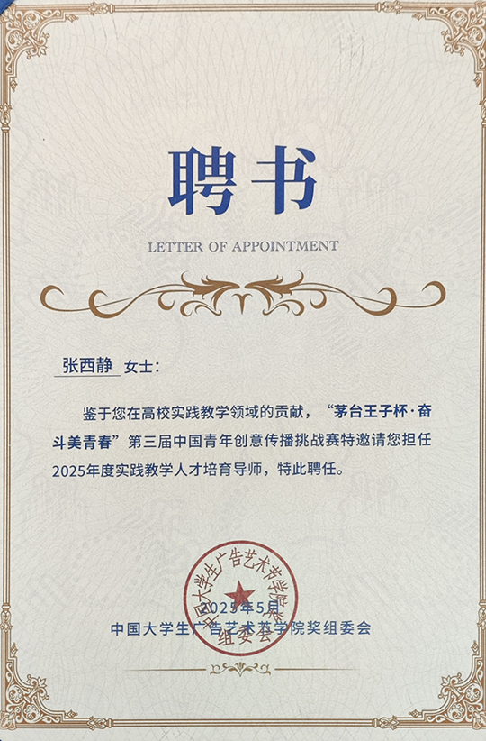 广告人文化集团副总裁李建强为特聘导师颁发聘书。张西静院长被聘为第三届中国青年创意传播挑战赛2025年度实践教学人才培育导师。