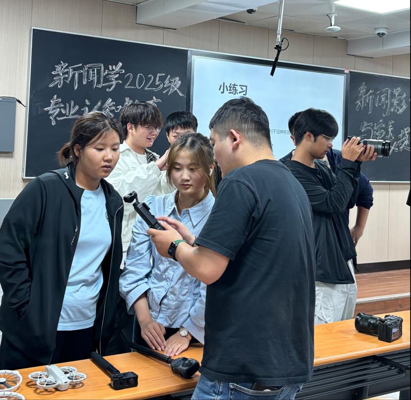 实操环节更是将氛围推向高潮。新生分组体验索尼单反相机、电影级镜头、大疆Pocket3及无人机等专业影像设备,在孔祥的指导下尝试高速连拍、高感光度拍摄、焦段切换等操作。无人机模拟飞行区域排起长队,同学们专注练习手持稳定设备技巧,认真记录参数设置要点。“第一次触摸专业摄像机,才真正懂了课堂上的技术知识”,一名新生兴奋表示。此次活动不仅强化了新生对摄像技术的理解,更让他们直观认识到融媒体时代视觉新闻的生产流程。