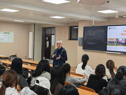 陕西广电融媒体集团三农中心主持人、主任播音员程海儒(艺名海成),为广播电视编导专业新生带来“从电视黄金时代到智媒体未来——编导的守正与创新”主题分享。他以“对专业认知多少”“近期是否看传统电视”等三连问开篇,结合仅12%新生接触传统电视端的调查结果,指出编导教育需从“电视工艺”转向“全域传播”,“核心不是镜头,而是叙事;不是频道,而是人心”。