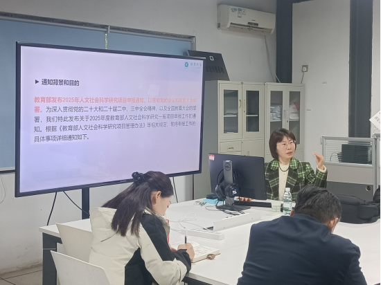 本次会议特邀电子信息学院副教授赵婧担任主讲嘉宾,围绕教育部社科项目的选题策略、撰写要点与申报流程进行了系统深入的分享。科研平台全体教师、副高以上职称教师及青年骨干教师参加了本次交流。