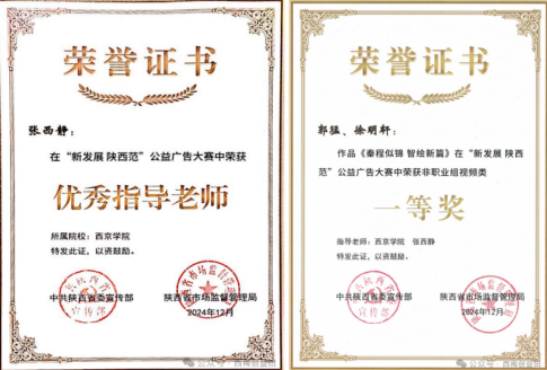 指导教师张西静院长表示:视频类一等奖仅有三项,此次获奖分量十足。一等奖作品《秦程似锦智绘新篇》由郭猛与徐明轩同学,仅用几天时间,高质量高效率完成,彰显了我院公益广告传播领域的专业实力,期待我院师生在下一届赛事当中继续拔得头筹!