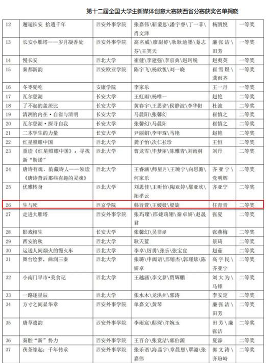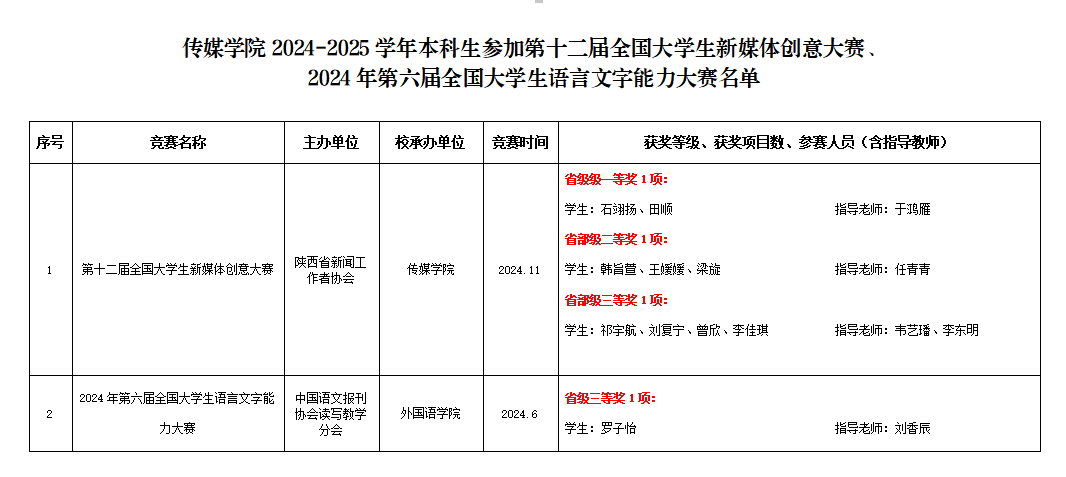 传媒学院2024-2025学年本科生参加第十二届全国大学生新媒体创意大赛、2024年第六届全国大学生语言文字能力大赛名单