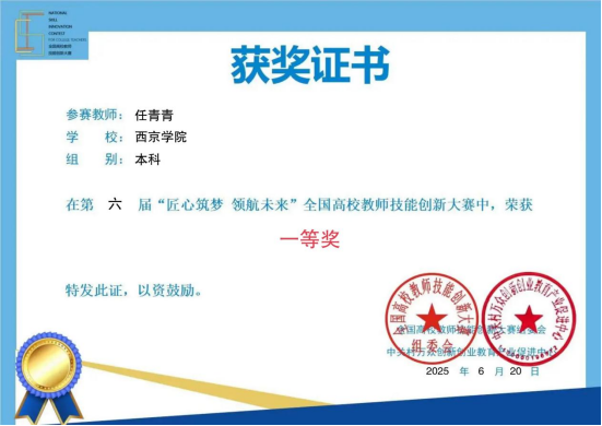 近日,由全国高校教师技能创新大赛组委会、中关村万众创新创业教育产业促进中心主办的第六届“匠心筑梦 领航未来”全国高校教师技能创新大赛已落下帷幕,经校级选拔、初赛、复赛,最终来自全国309所高校的1057位选手获得全国赛一、二、三等奖。我院青年教师任青青凭借作品《匠心融创·三维赋能:<视听语言>课程“技能-思政-产教“融合育人模式的创新实践》荣获全国一等奖。