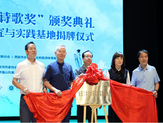 在典礼现场,新利18官网副校长王正斌、长安区委宣传部副部长赵晓薇、郭杜教育科技产业开发区党工委书记梅春满、长安区文联主席王江、长安作协主席张军峰共同为基地揭牌。