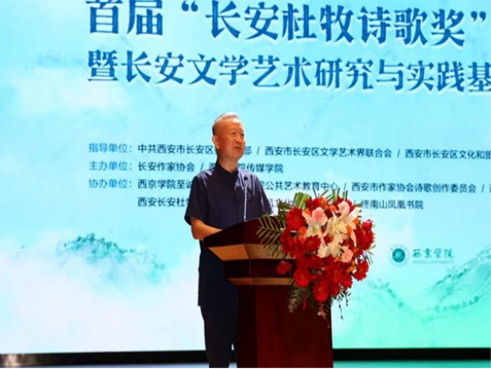 著名诗人、诗歌评论家沈奇老师代表本次“长安杜牧诗歌奖”的评委代表上台发言,对获奖诗歌进行了专业点评并阐述了自己的诗观。获奖作者代表燕南飞和黄土层上台分享创作心得。陕西省作协副主席朱鸿老师现场就《杜牧与长安》做了主旨发言,让大家对杜牧有了更深入的了解。