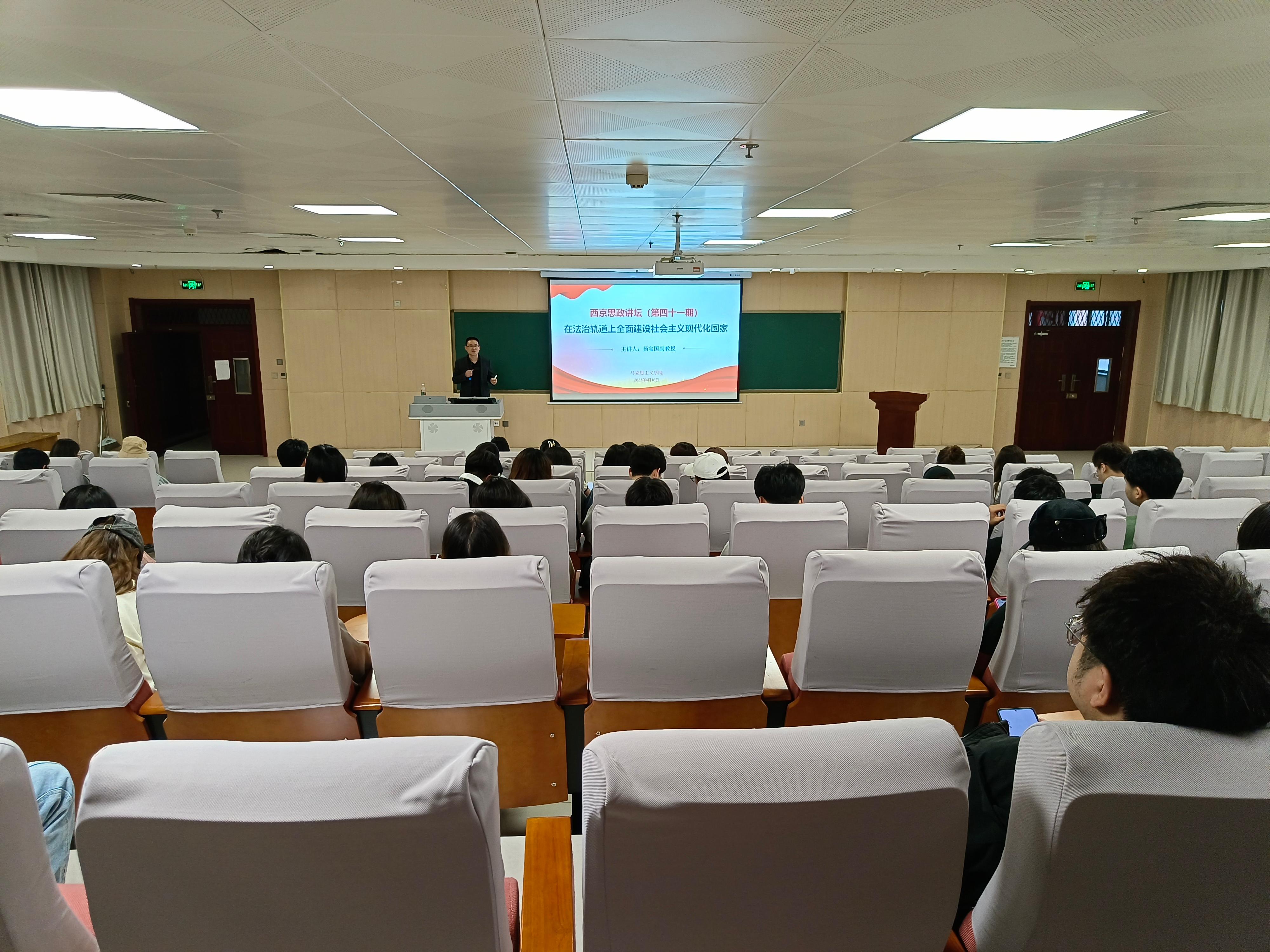 4月18日下午,第四十一期西京思政讲坛在图书馆102报告厅举行,本次活动由马克思主义学院和设计艺术学院联合主办,马克思主义学院杨宝国副教授作题为“在法治轨道上全面建设社会主义现代化国家”专题报告,130余名学生参加本次活动。
