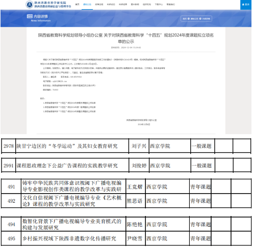 传媒学院一直高度重视和支持教科研工作,特制定了《传媒学院青年教师导师制实施细则》,该细则通过充分发挥高级职称教师和骨干教师的优质师资,对青年教师教科研项目申报给予帮扶,以培养教学科研的优势群体,全方位提高学院师资队伍素质和教学科研水平。在2025年省社科联项目立项中,学院共申报5项课题,全部成功立项,立项成功率高达100%,立项数也实现了从去年的2项增至5项的历史性突破。此外,在陕西省教育科学“十四五”规划2025年度课题立项中也取得了显著成绩,教师申报的7项课题中有6项获得批准,且涵盖了一般课题和青年课题多个领域。这些课题的成功立项是我院教师在教育科研工作上不懈努力和积极进取的成果,不仅为学院的教育科研工作奠定了坚实基础,更为未来教育和科研的发展提供了强有力支持。