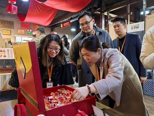 园区工作人员为一行人介绍了中心各种酒文化产品,这些产品不仅展示了酒文化的独特韵味,还精妙地融入了陕西经典文化元素,实现了传统与现代的和谐共融。工作人员详细的介绍了每件产品背后故事、制作工艺及精美的酒器、独特的酒标设计,每一件都承载着深厚的历史文化底蕴。其中,以兵马俑为原型和生肖结合为载体的酒具,赢得了众人的瞩目,成为一大亮点,它在实用性和观赏性上实现了新的突破,此外,众多创意独特的文创产品也给参观者留下了深刻的印象。